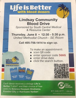 The Lindsay Community Blood Drive will be held at the United Methodist Church from 12:30 p.m. until 5:30 p.m. The church is located at 114 W. Chickasaw in Lindsay.