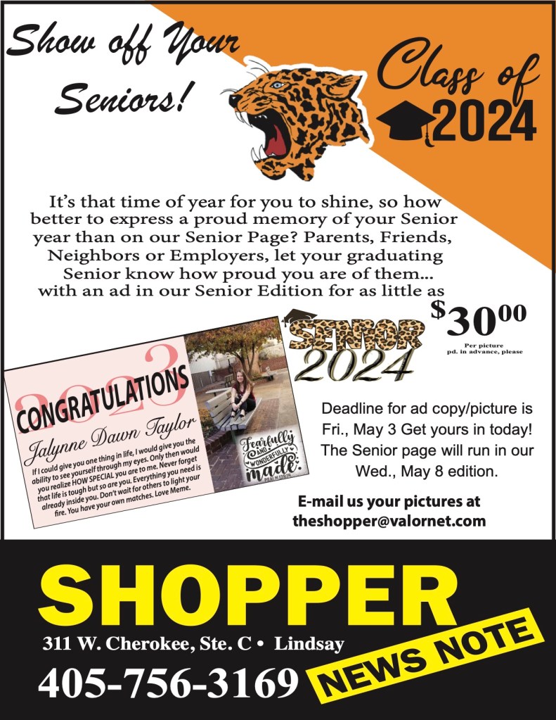 UncategorizedIt’s that time of year and we are working on our senior edition. If you would like to recognize your senior, give us a call at 405-756-3169. Congratulations seniors 2024!! March 7, 2024 Shopper News Note Share this: Click to share on X (Opens in new window) X Click to share on Facebook (Opens in new window) Facebook Like Loading... Related Published by Shopper News Note View all posts by Shopper News Note