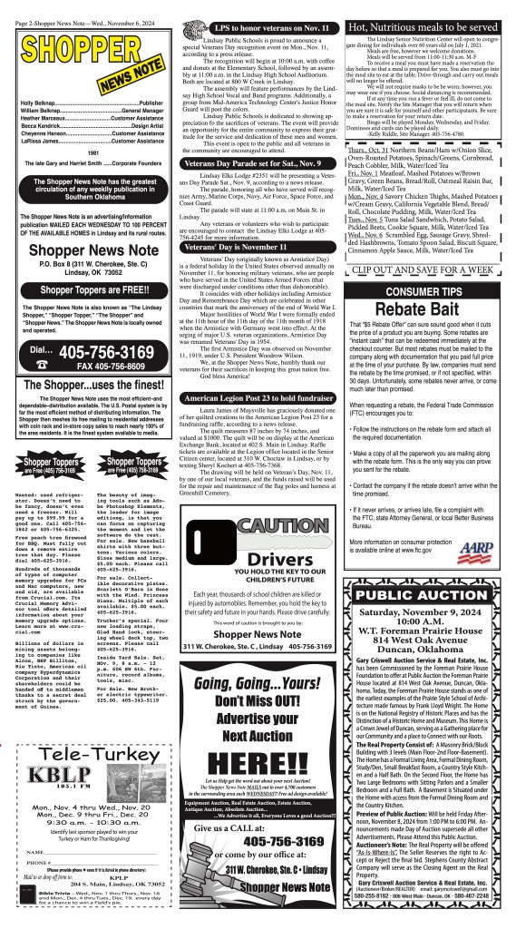 UncategorizedNovember 6, 2024 edition November 6, 2024November 7, 2024 Shopper News Note CORRECTION: This week’s publication had last week’s Hot Meal Menu by mistake. Please see this week’s menu above. The Shopper News Note apologizes for any confusion or inconvenience due to this error. Share this: Click to share on X (Opens in new window) X Click to share on Facebook (Opens in new window) Facebook Like Loading...