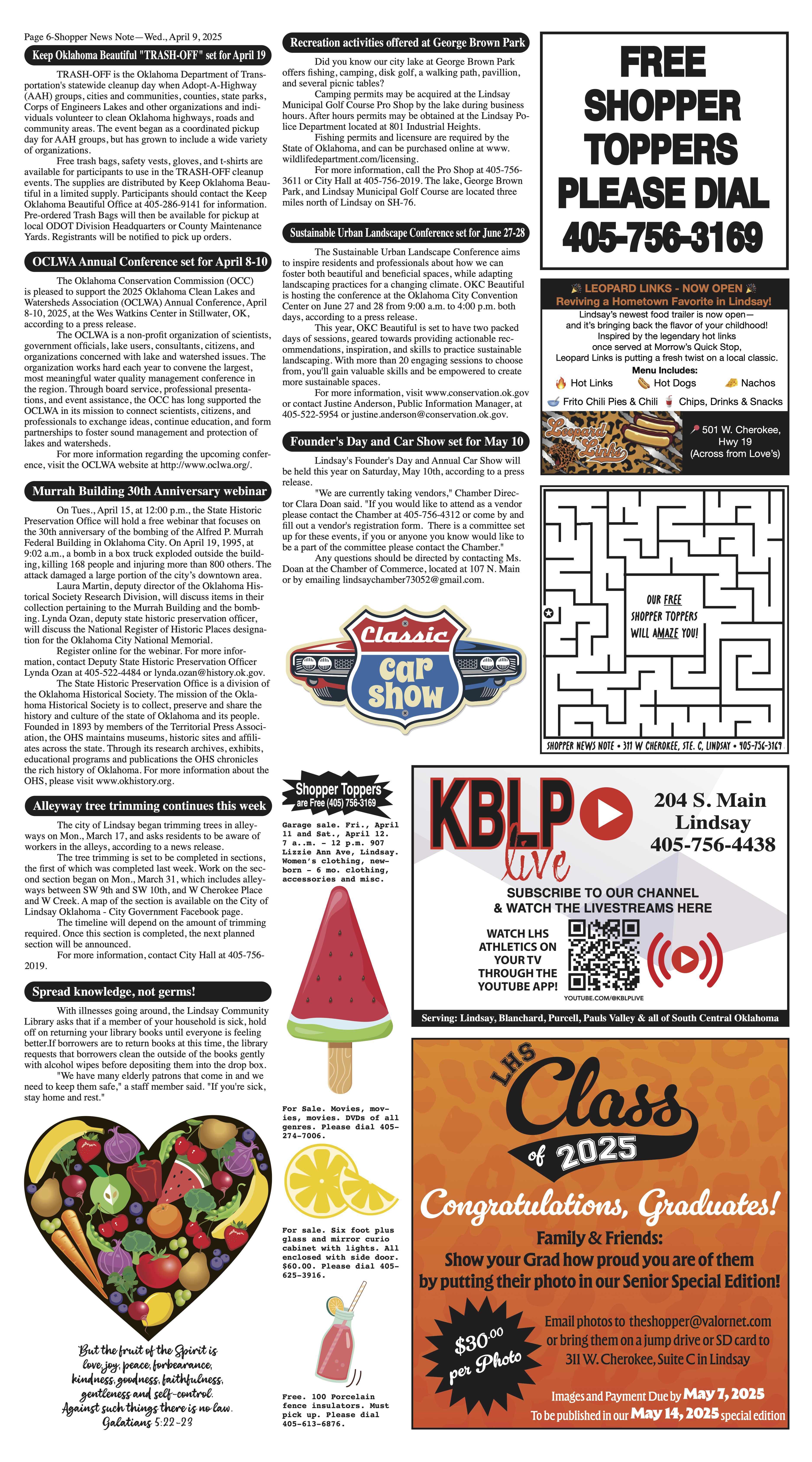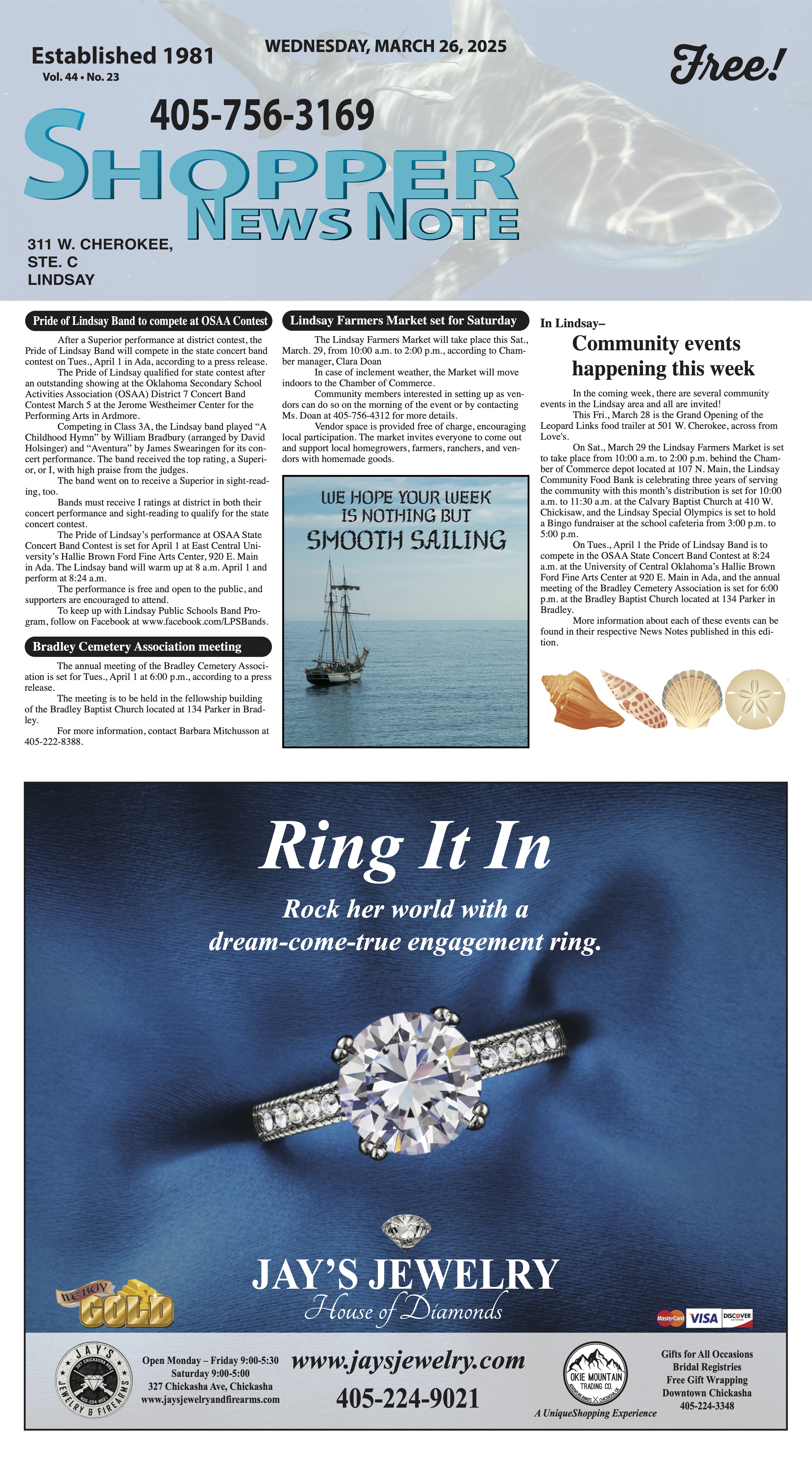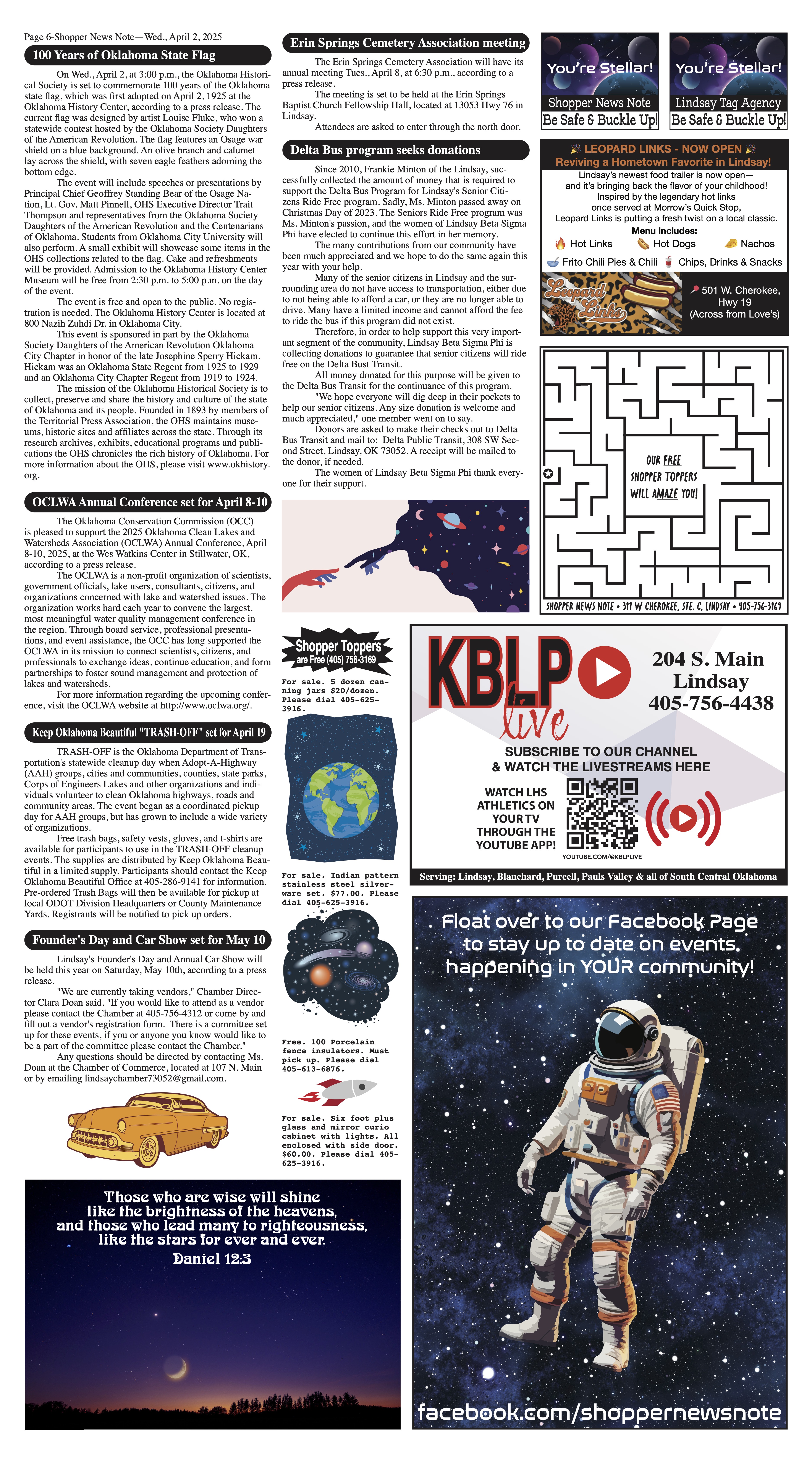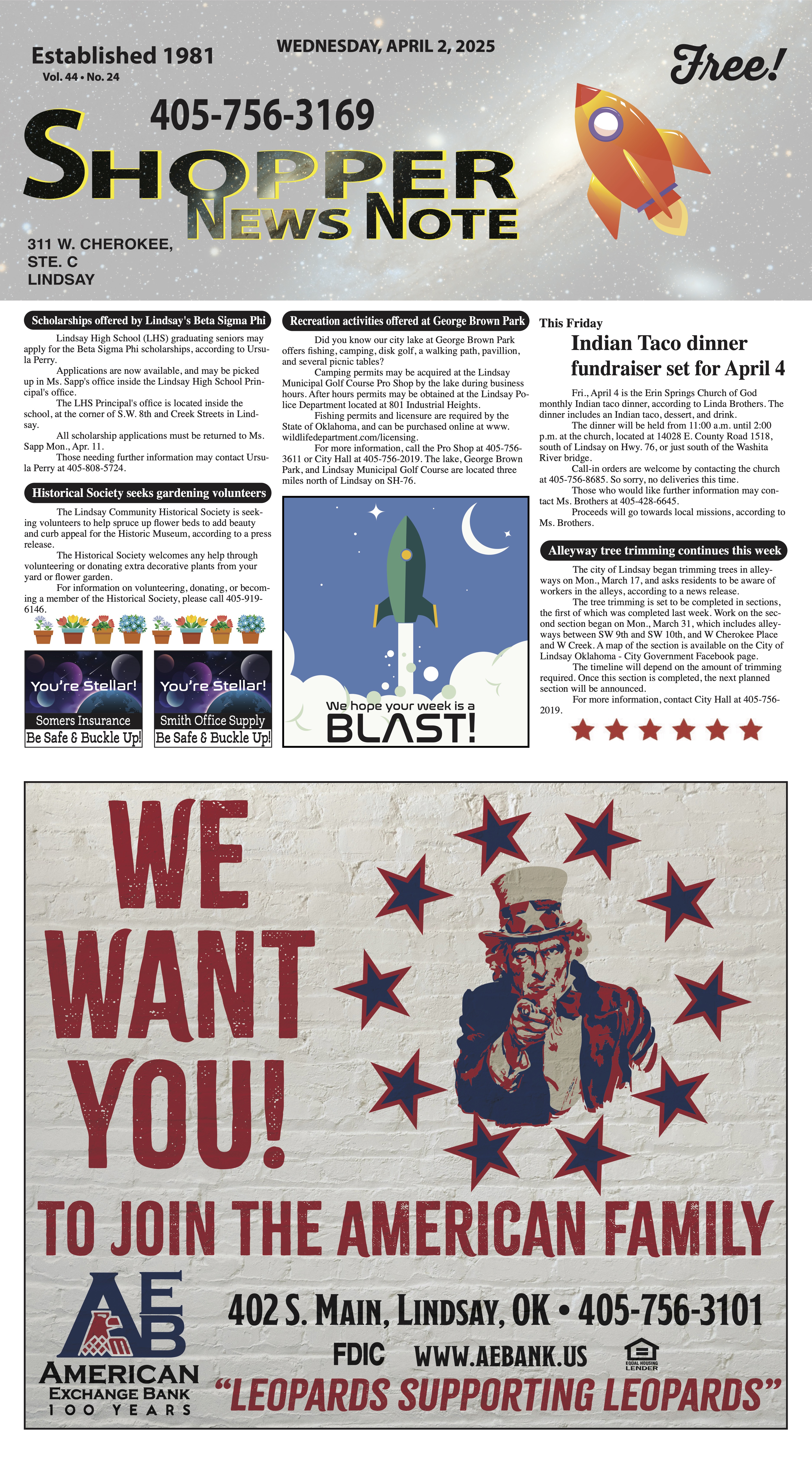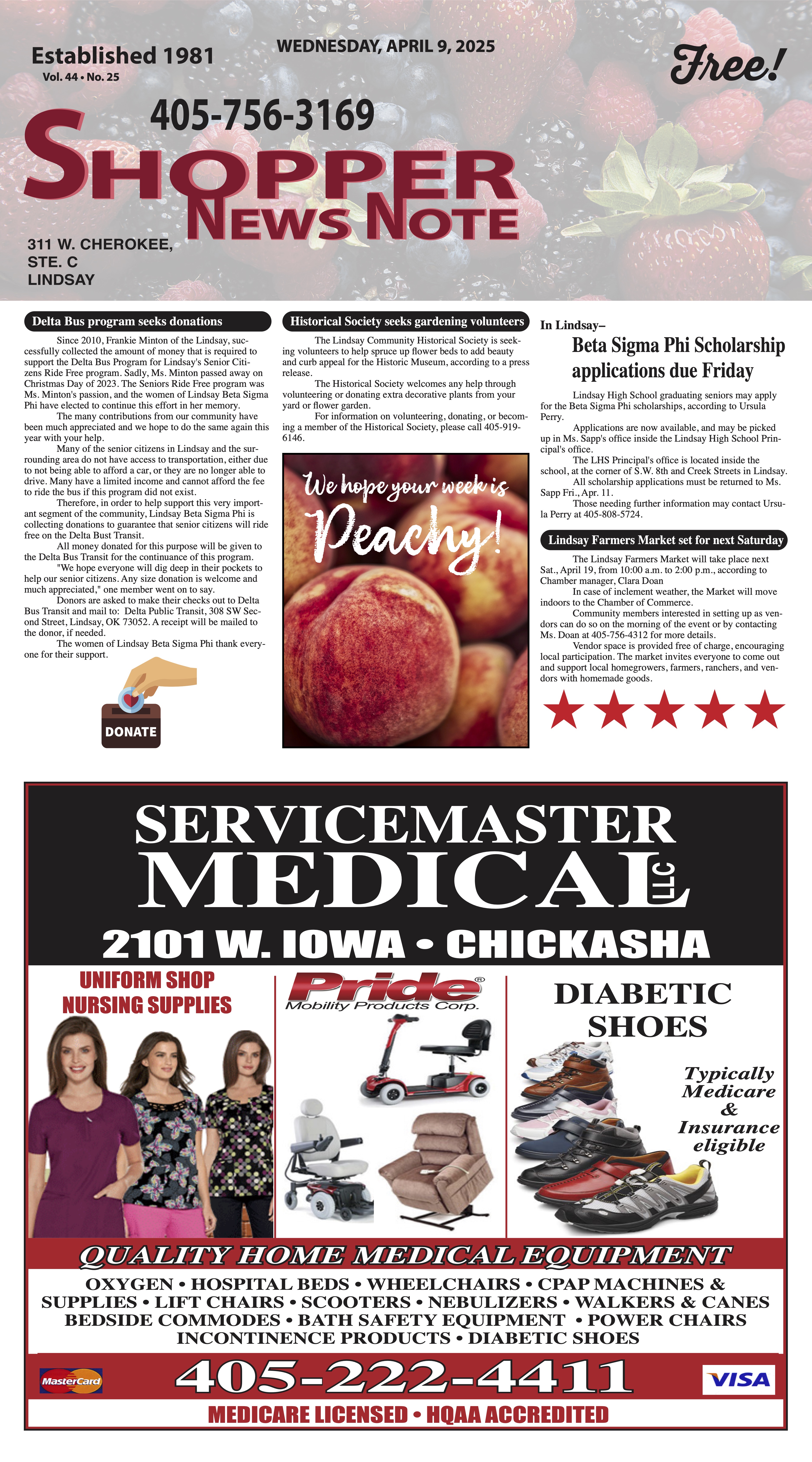 UncategorizedApril 2, 2025 edition April 2, 2025 Shopper News Note CORRECTION: The Beta Sigma Phi scholarship applications are due on Fri., April 11, 2025. Share this: Click to share on X (Opens in new window) X Click to share on Facebook (Opens in new window) Facebook Like Loading...